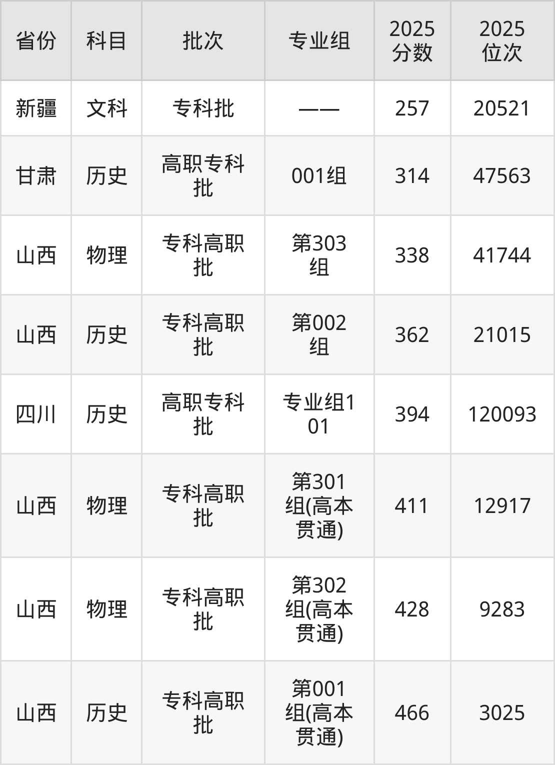 2025年晋中职业技术学院在各省历史类和文科的录取分数线位于257分-466分之间。