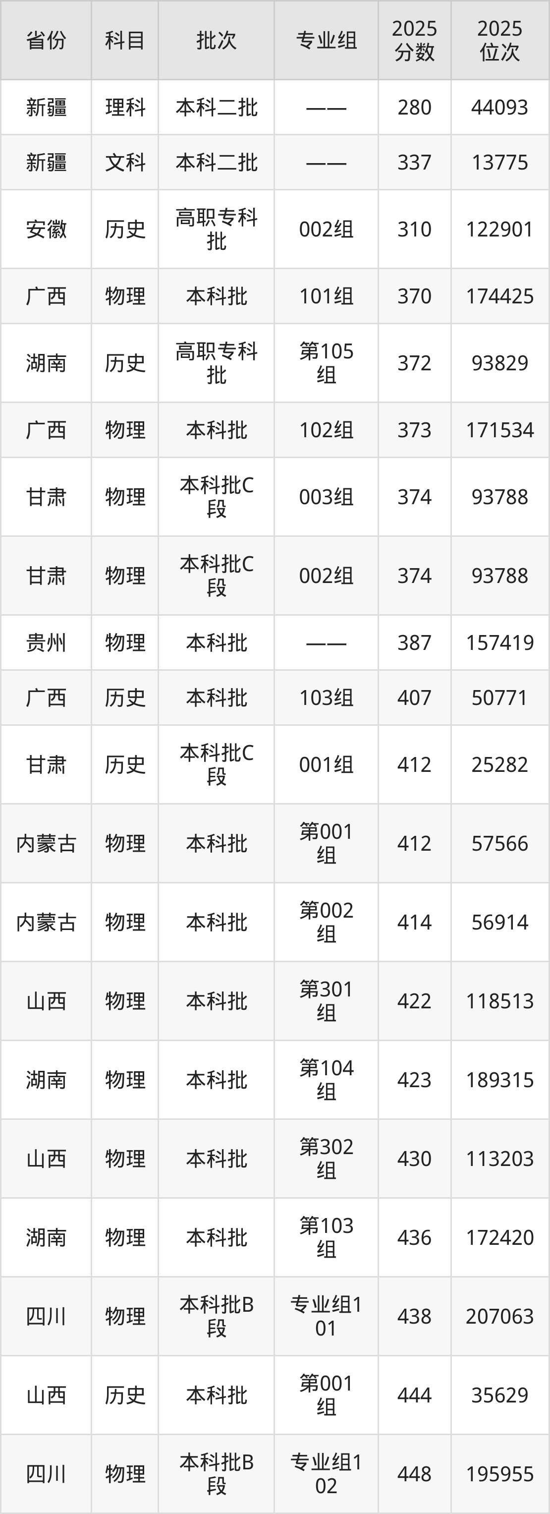 最低录取分数线是280分,对应位次是44093名,招生地区为新疆;