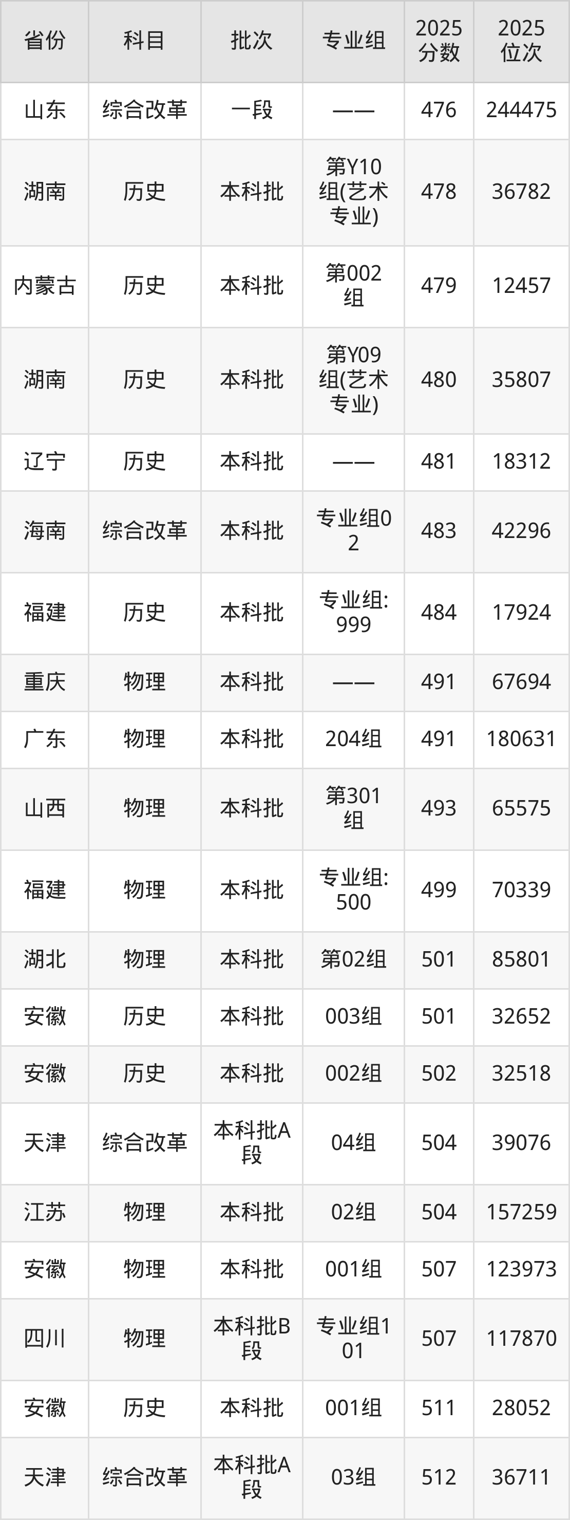 最低录取分数线是476分,对应位次是244475名,招生地区为山东;