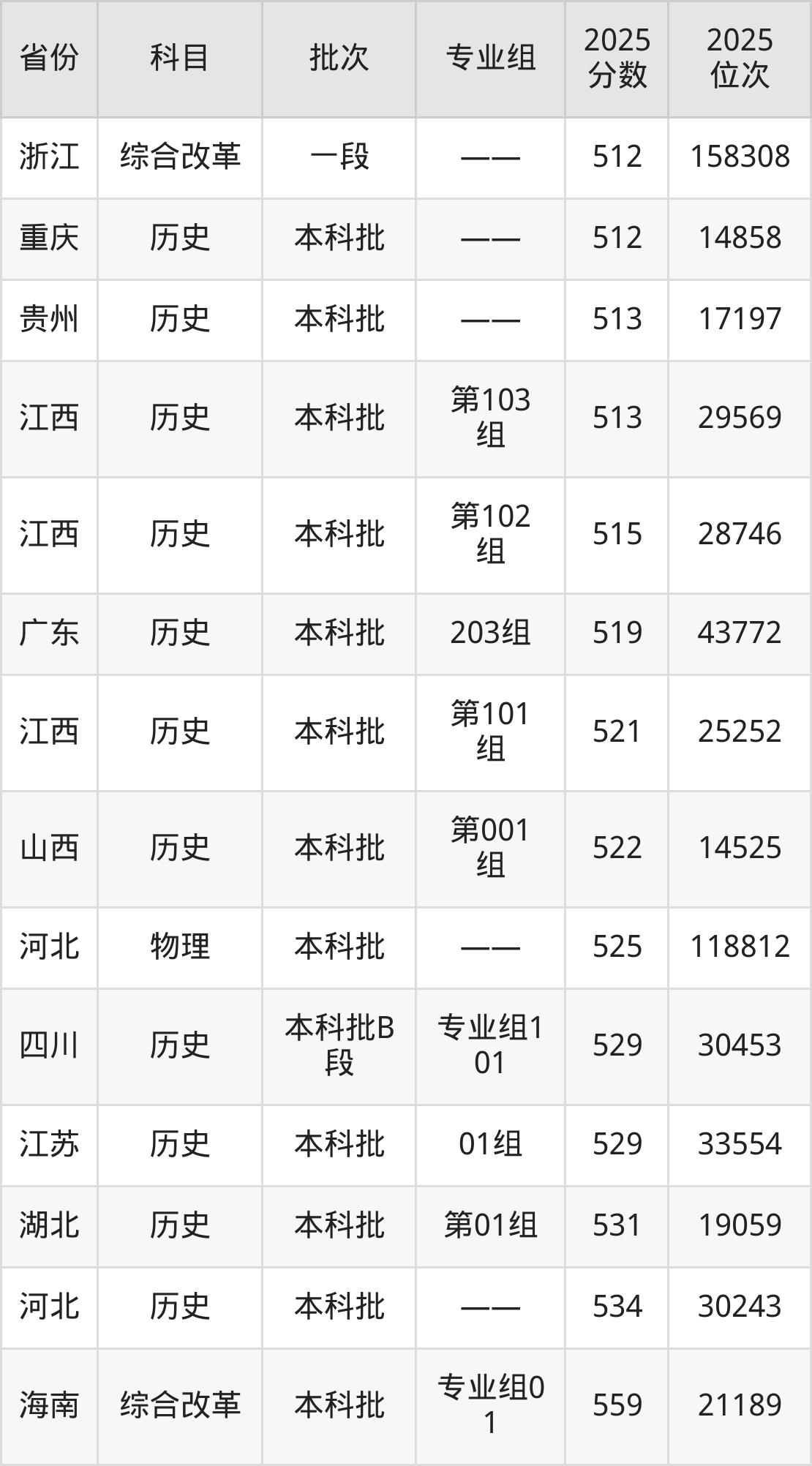 最高录取分数线是559分,对应位次是21189名,招生地区为海南。