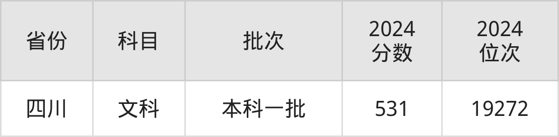 最低录取分数线是531分,对应位次是19272名,招生地区为四川。