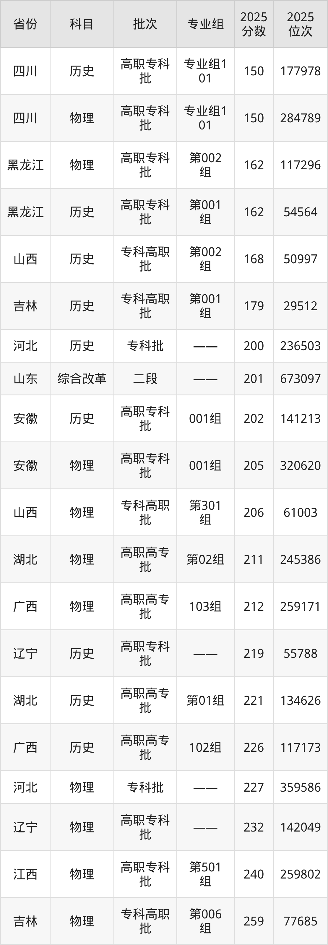 最低录取分数线是150分,对应位次是177978名,招生地区为四川;