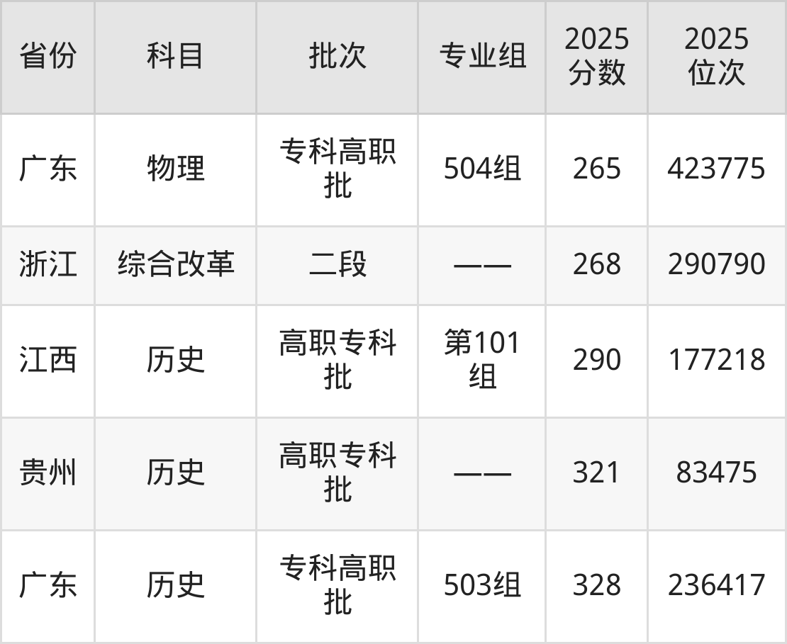 最高录取分数线是265分,对应位次是423775名,招生地区为广东。