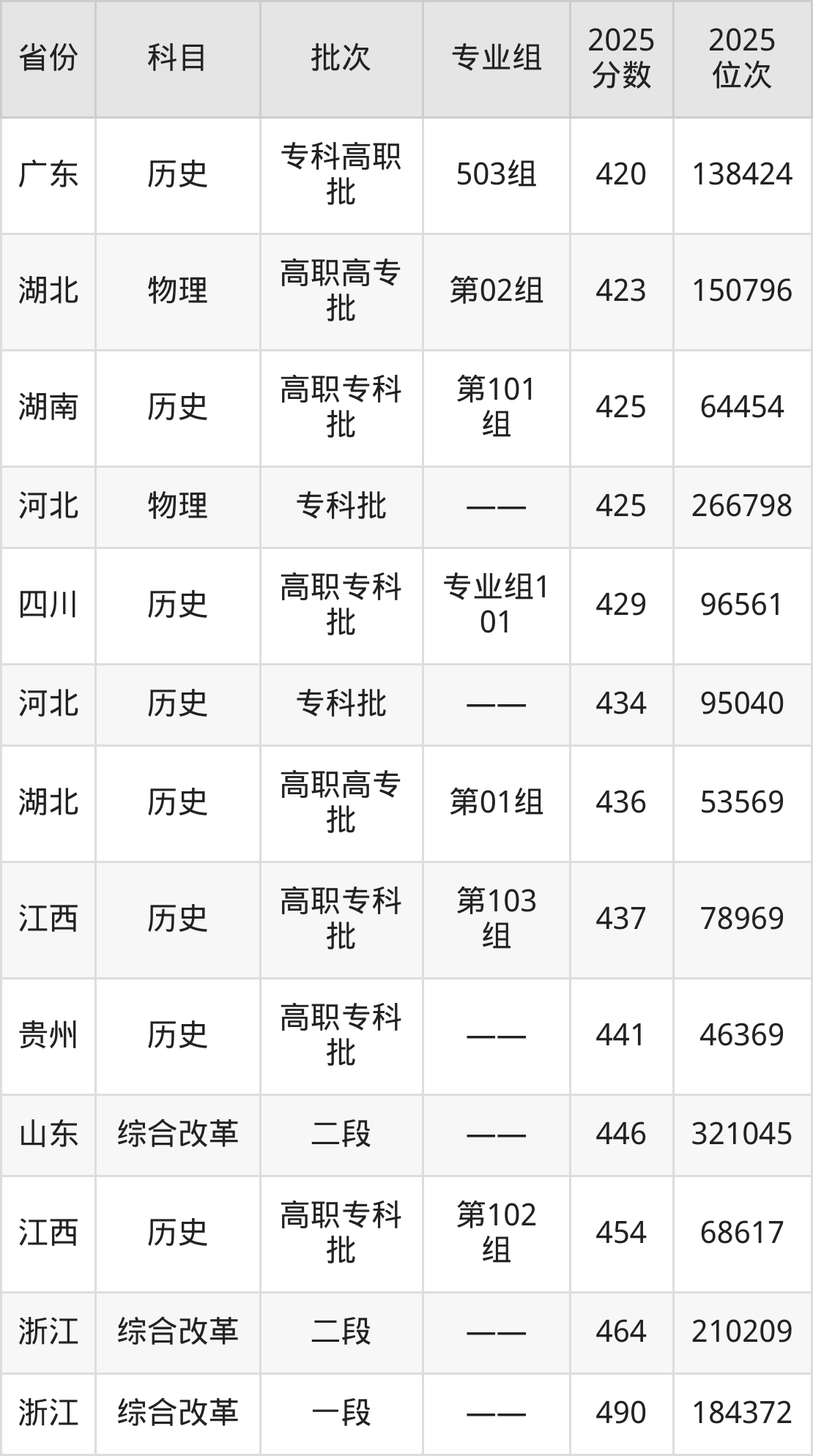 2025年江西司法警官职业学院在各省历史类的录取分数线位于365分-454分之间。