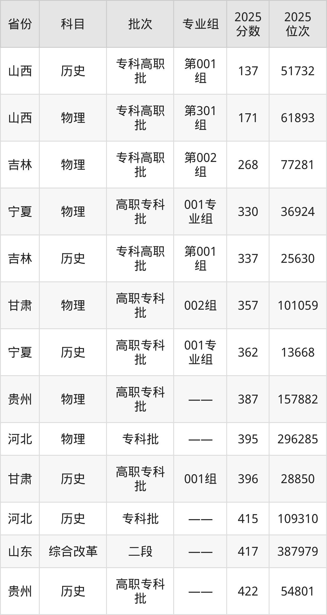 最低录取分数线是417分,对应位次是387979名,招生地区为山东。