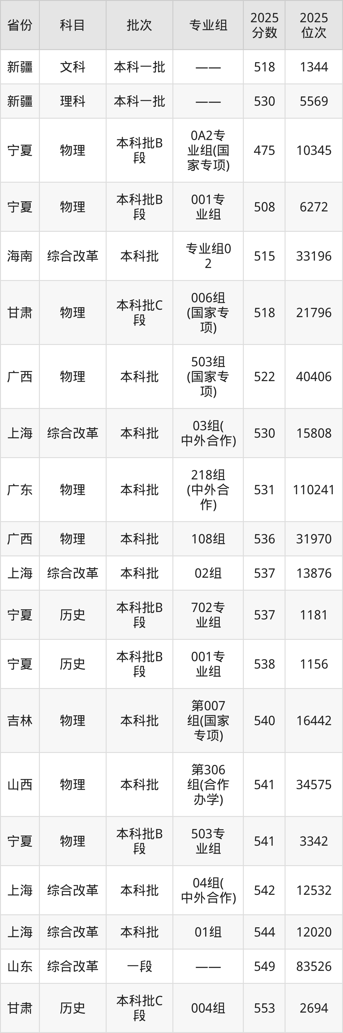 最低录取分数线是518分,对应位次是1344名,招生地区为新疆;