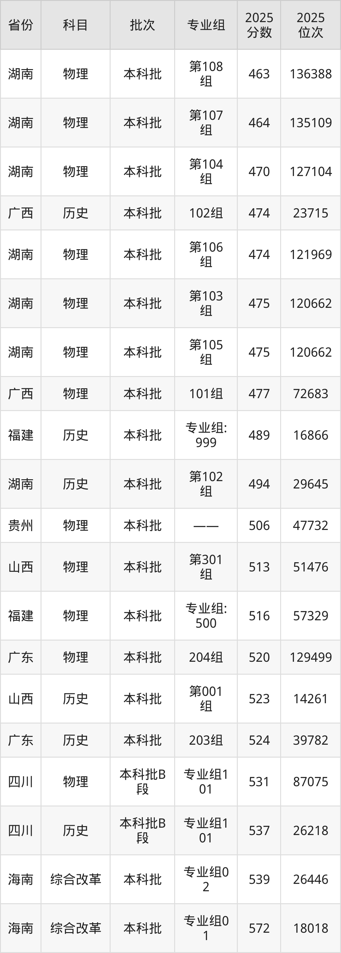 最低录取分数线是463分,对应位次是136388名,招生地区为湖南;