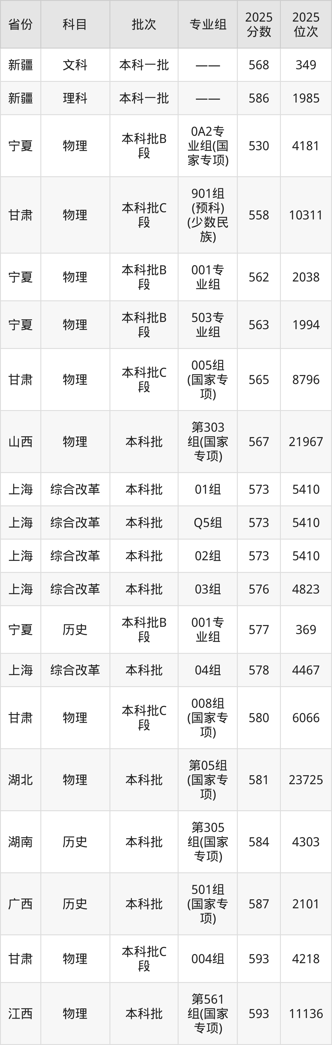 最低录取分数线是568分,对应位次是349名,招生地区为新疆;