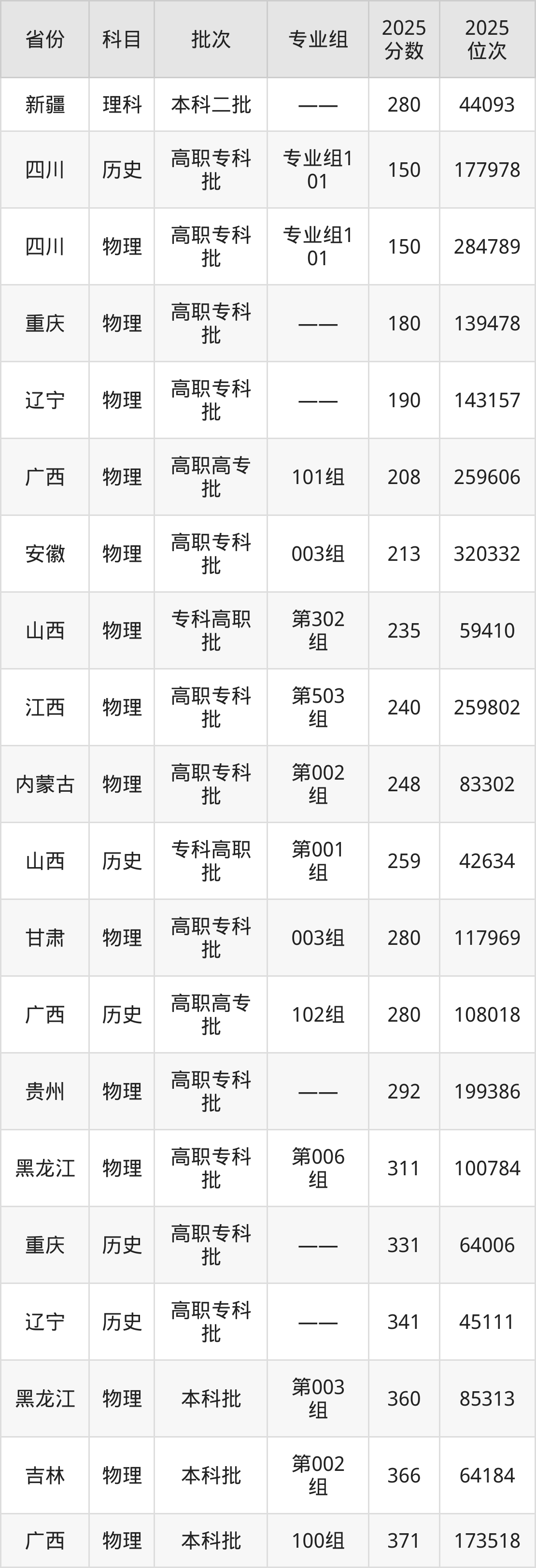 最低录取分数线是150分,对应位次是177978名,招生地区为四川;