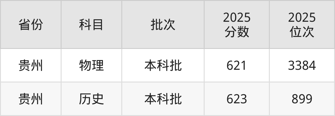 最低录取分数线是623分,对应位次是899名,招生地区为贵州。