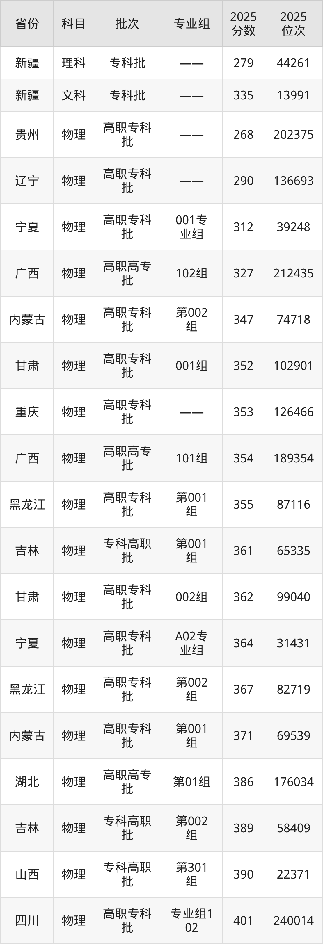 2025年天津医学高等专科学校在各省普通批录取分数线一览表: