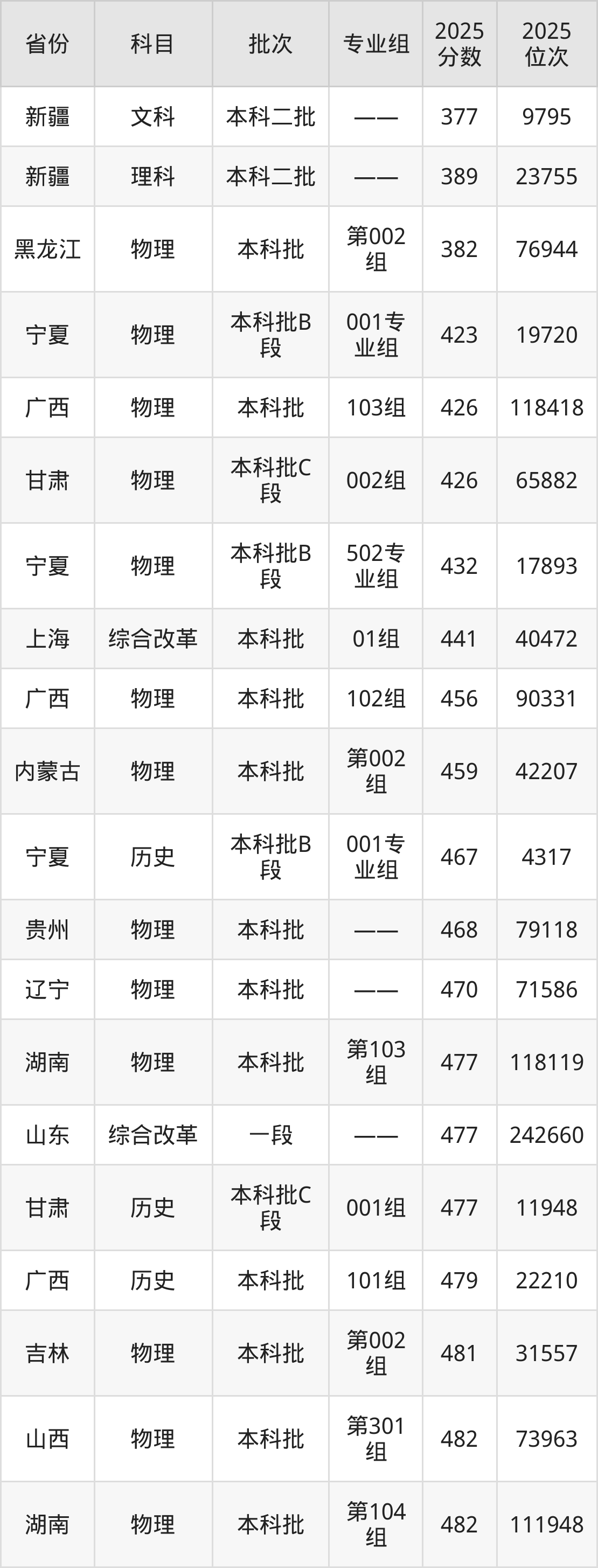 最低录取分数线是377分,对应位次是9795名,招生地区为新疆;