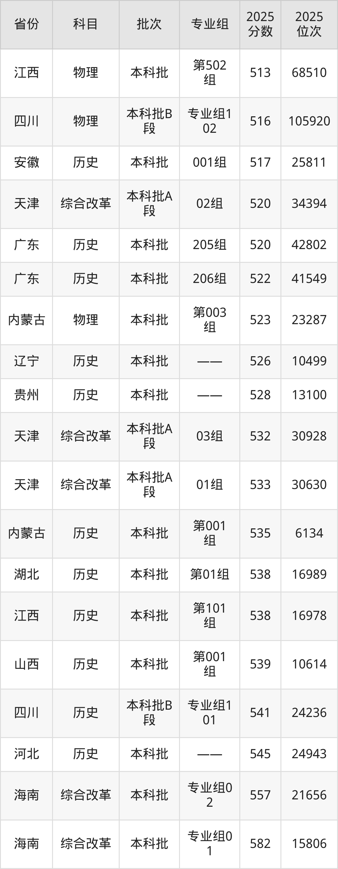 最高录取分数线是582分,对应位次是15806名,招生地区为海南。
