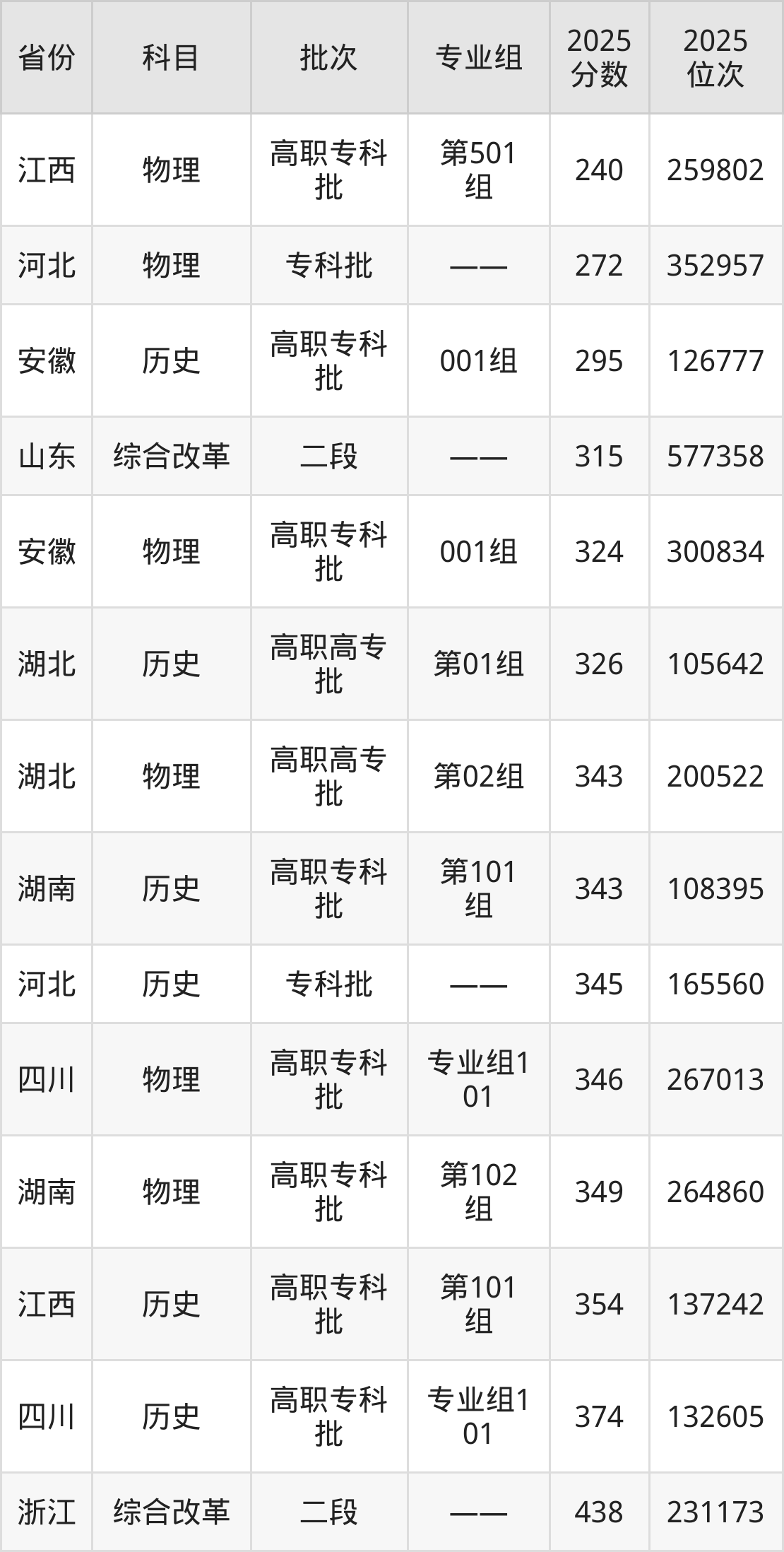 2025年江西樟树中医药职业学院在各省普通批录取分数线一览表: