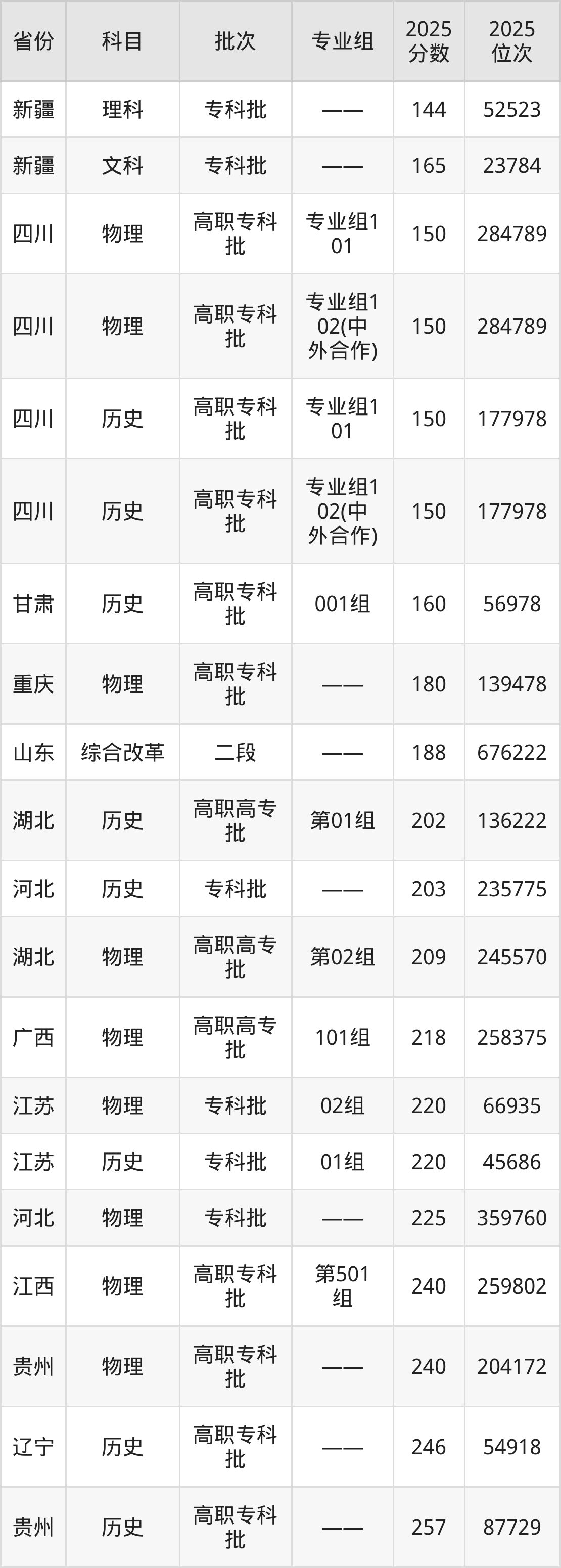 最低录取分数线是150分,对应位次是177978名,招生地区为四川;