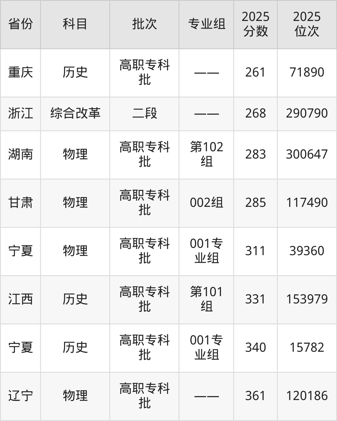 2025年重庆电讯职业学院在各省普通批录取分数线一览表: