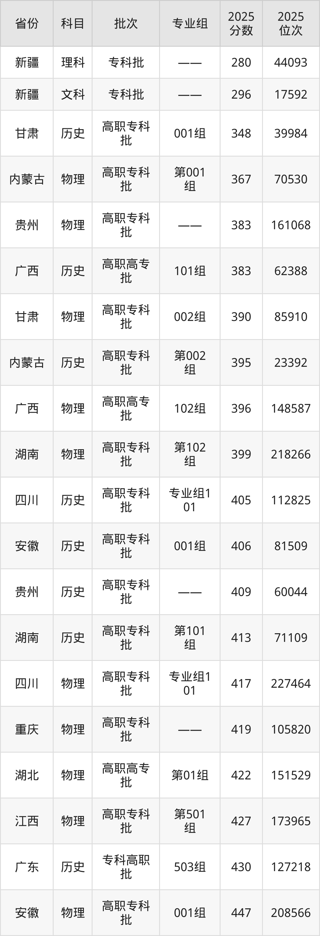 2025年湖南信息职业技术学院在各省物理类和理科的录取分数线位于280分-449分之间。