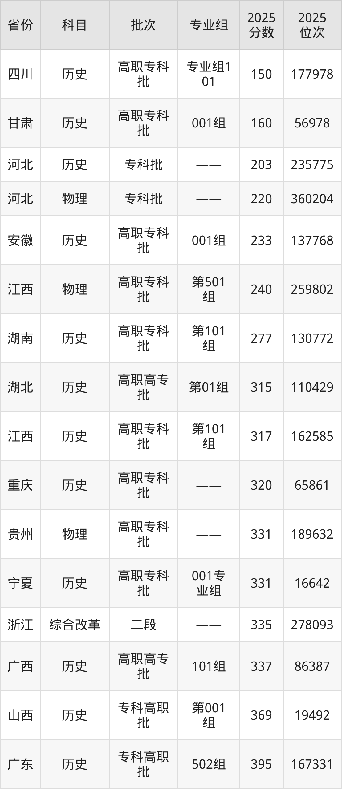 2025年江西洪州职业学院在各省普通批录取分数线一览表: