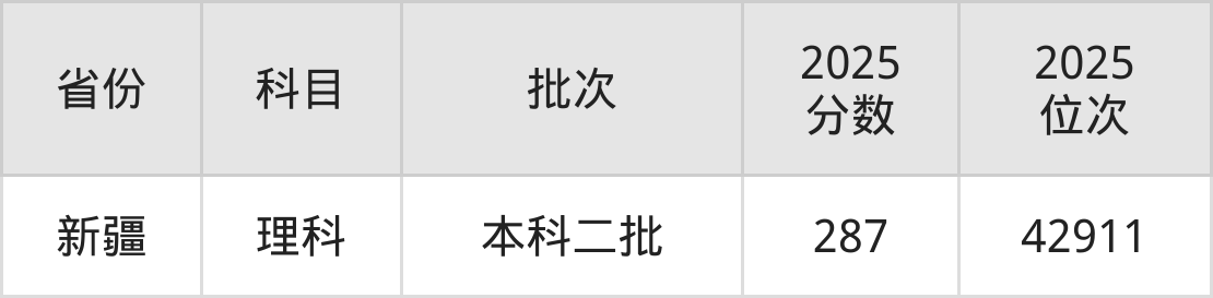最低录取分数线是287分,对应位次是42911名,招生地区为新疆。
