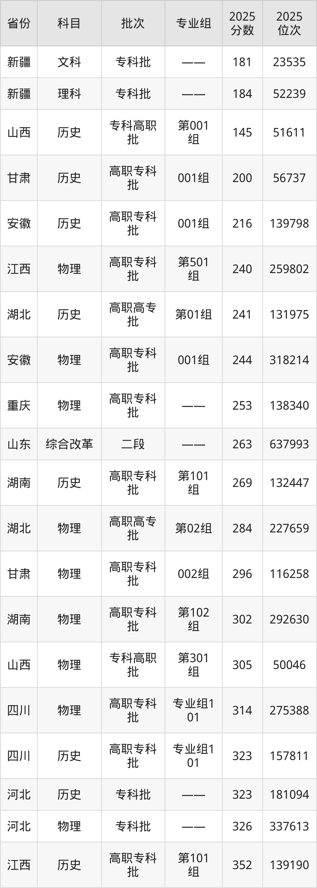 2025年图木舒克职业技术学院在各省普通批录取分数线一览表: