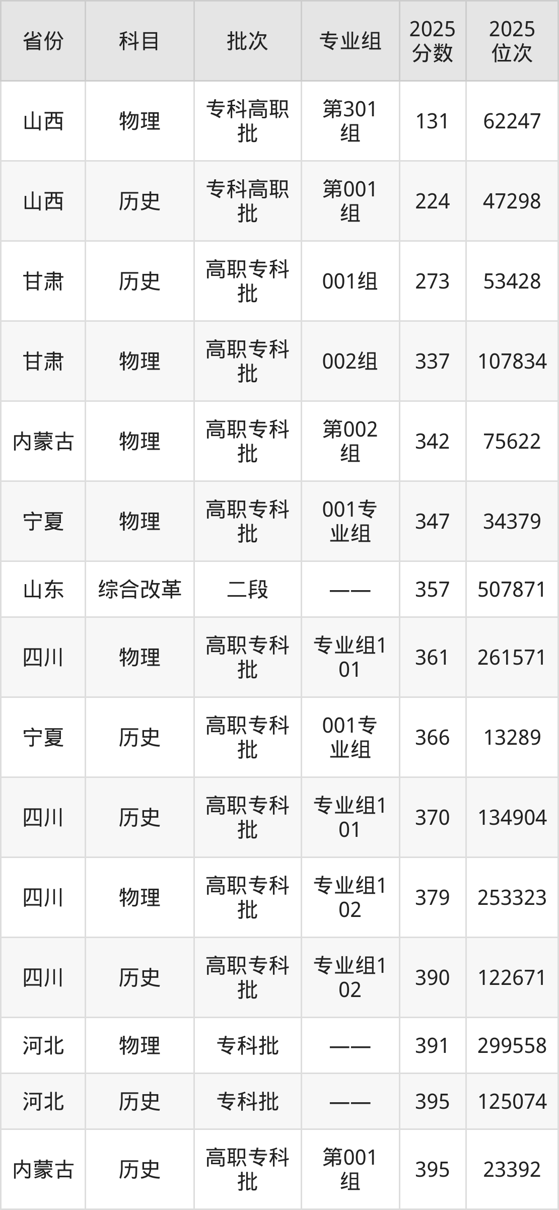 2025年山西管理职业学院在各省普通批录取分数线一览表: