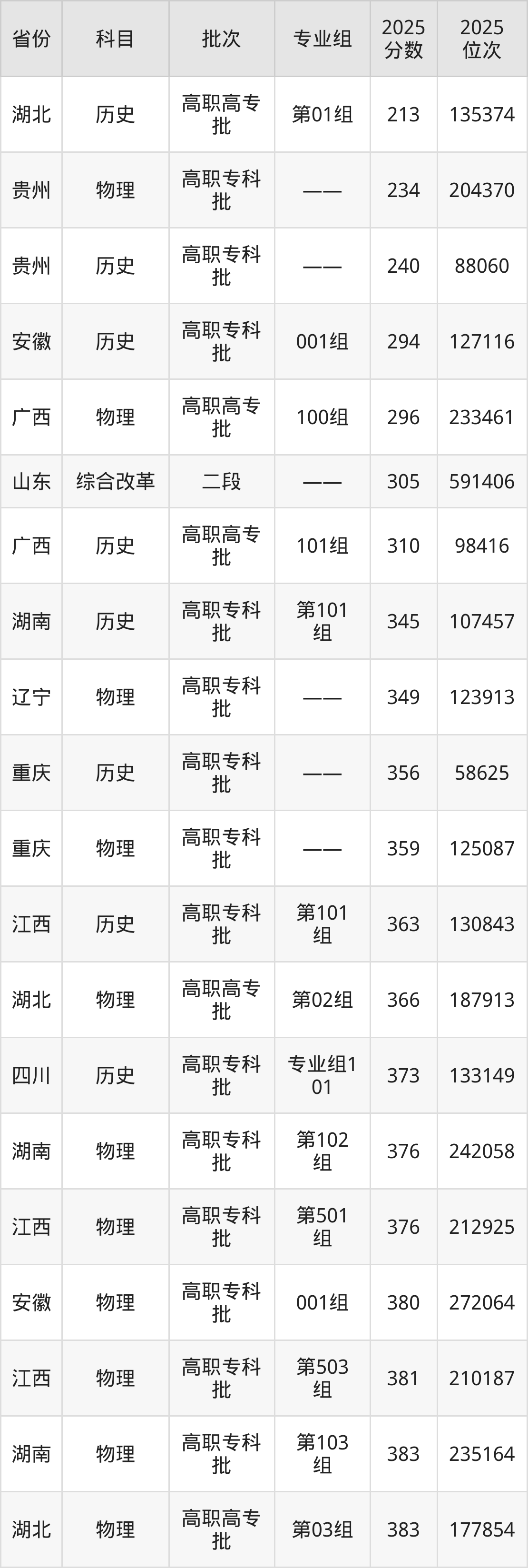 2025年贵州航空职业技术学院在各省普通批录取分数线一览表: