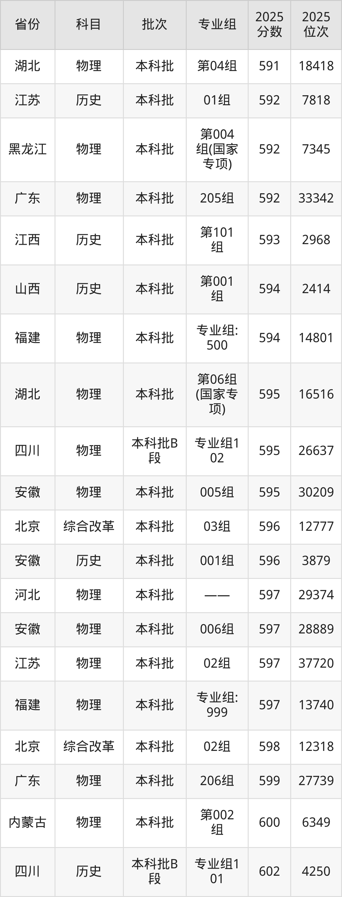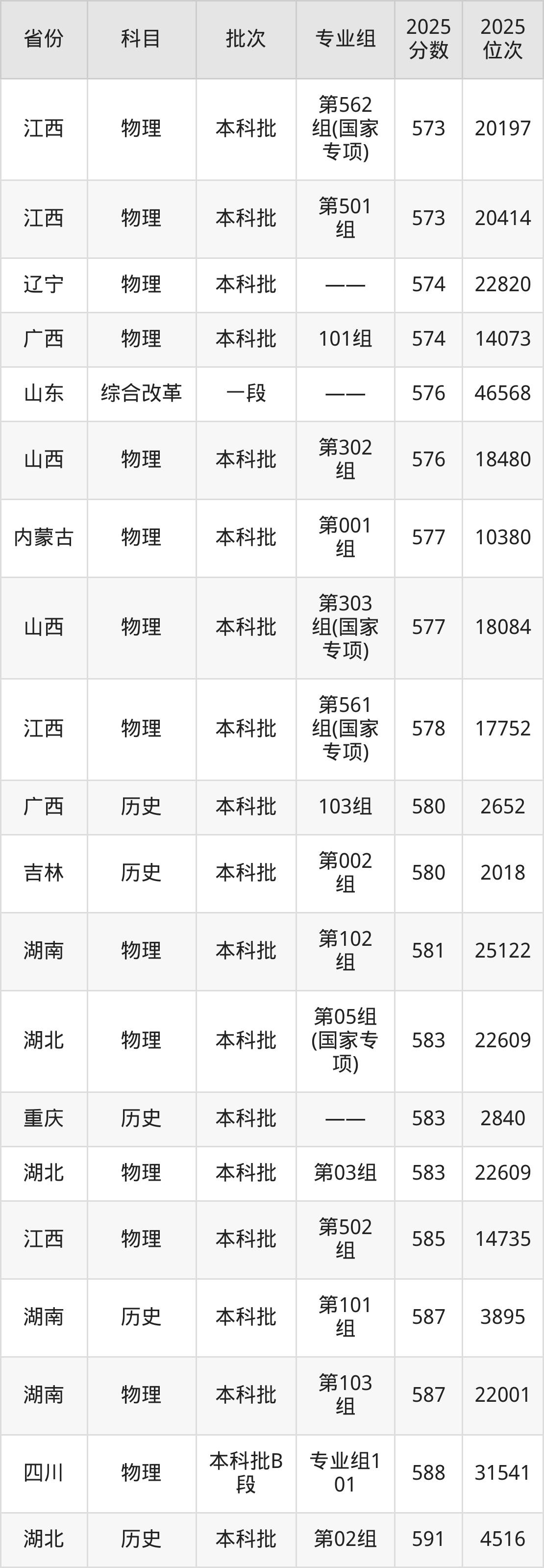 最低录取分数线是580分,对应位次是2652名,招生地区为广西;