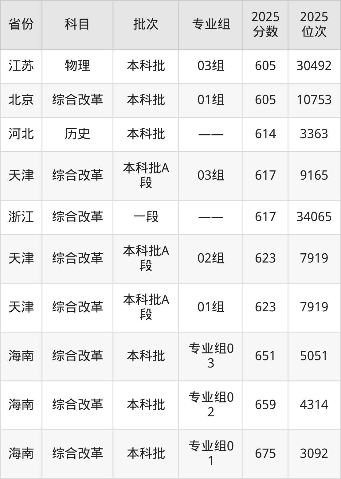 最高录取分数线是605分,对应位次是30492名,招生地区为江苏。