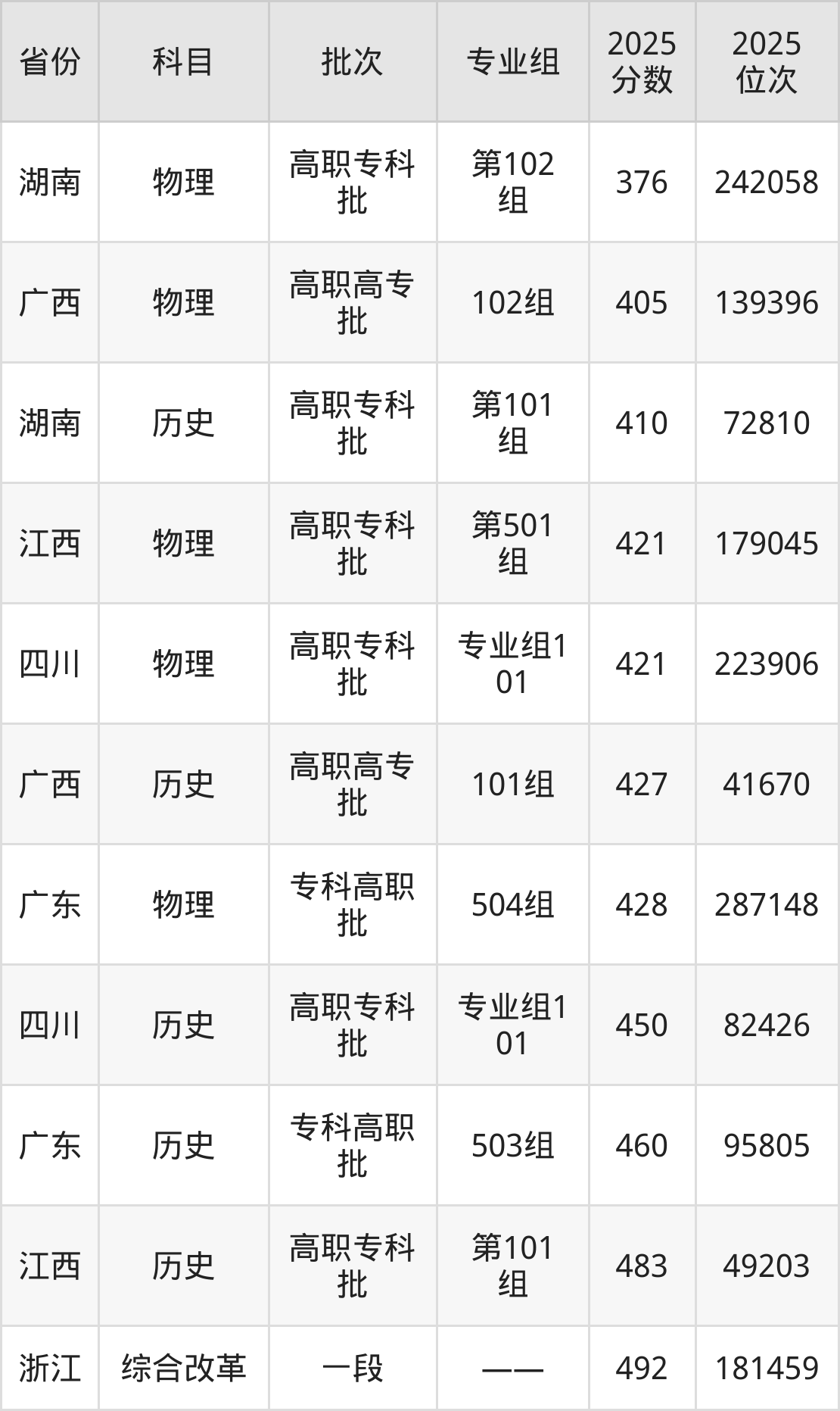 2025年湖南中医药高等专科学校在各省物理类的录取分数线位于376分-428分之间。