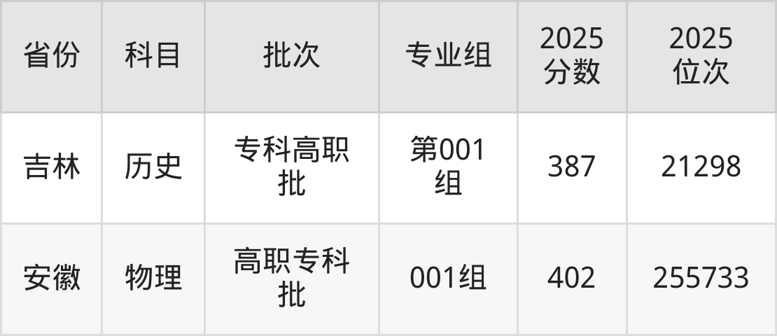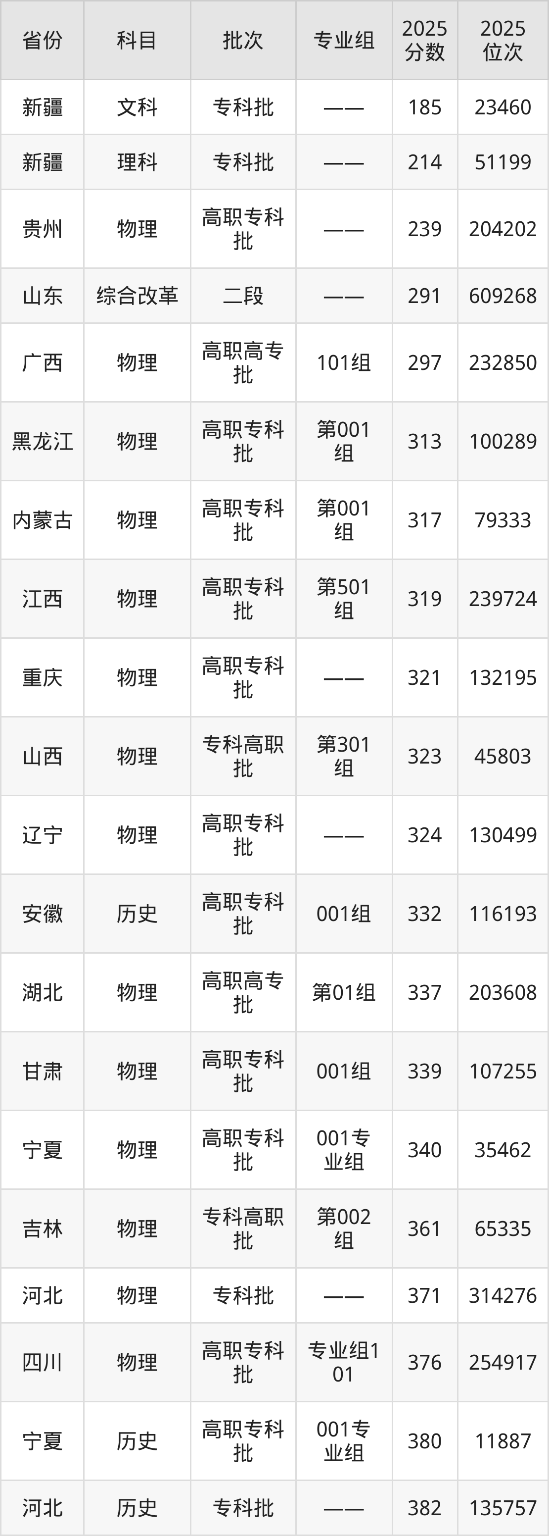 2025年山东铝业职业学院在各省普通批录取分数线一览表: