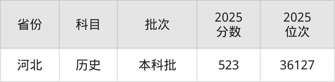 最低录取分数线是523分,对应位次是36127名,招生地区为河北。