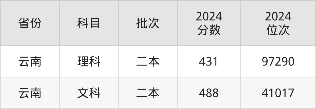最低录取分数线是431分,对应位次是97290名,招生地区为云南。
