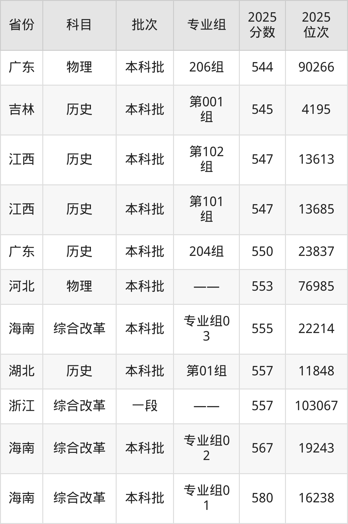 最高录取分数线是580分,对应位次是16238名,招生地区为海南。
