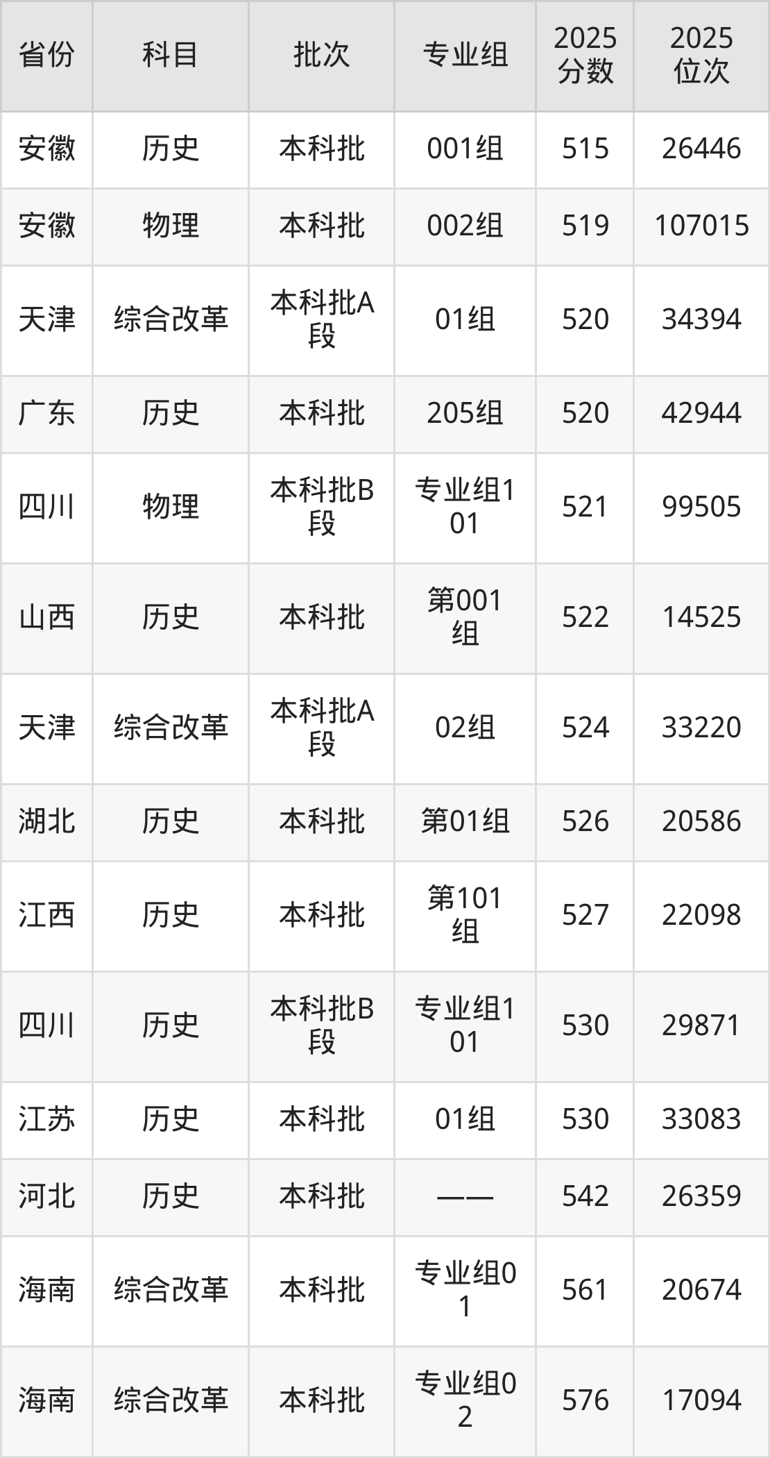 最高录取分数线是576分,对应位次是17094名,招生地区为海南。