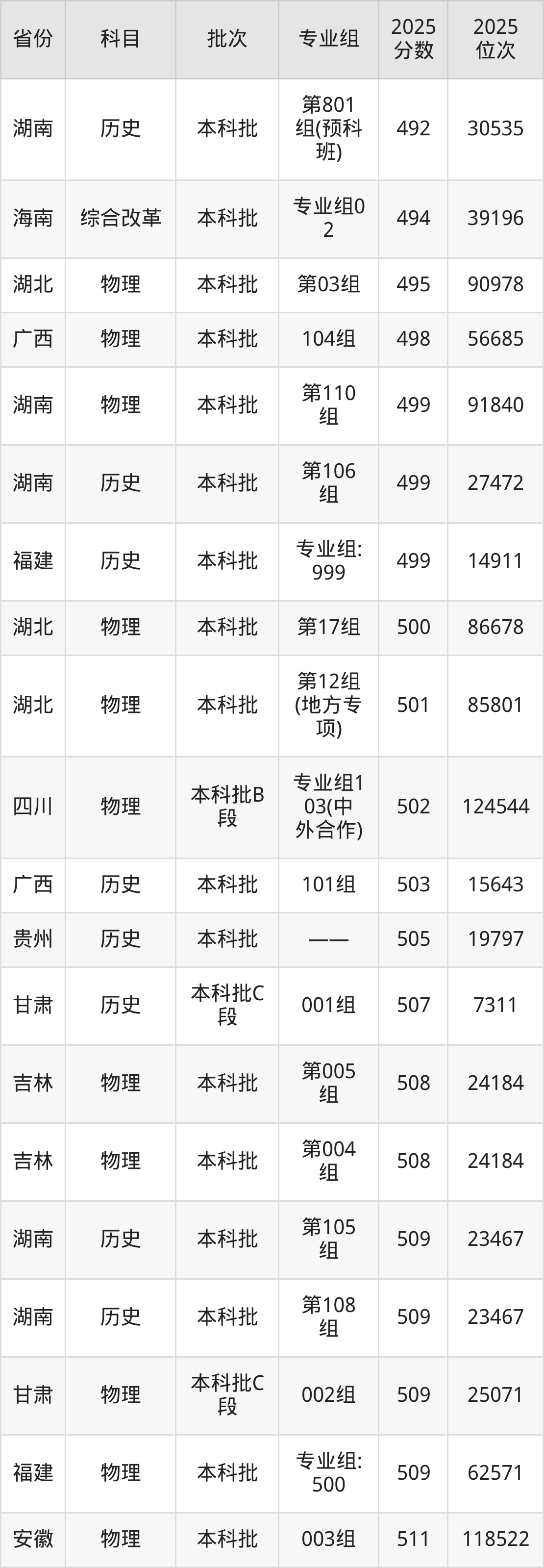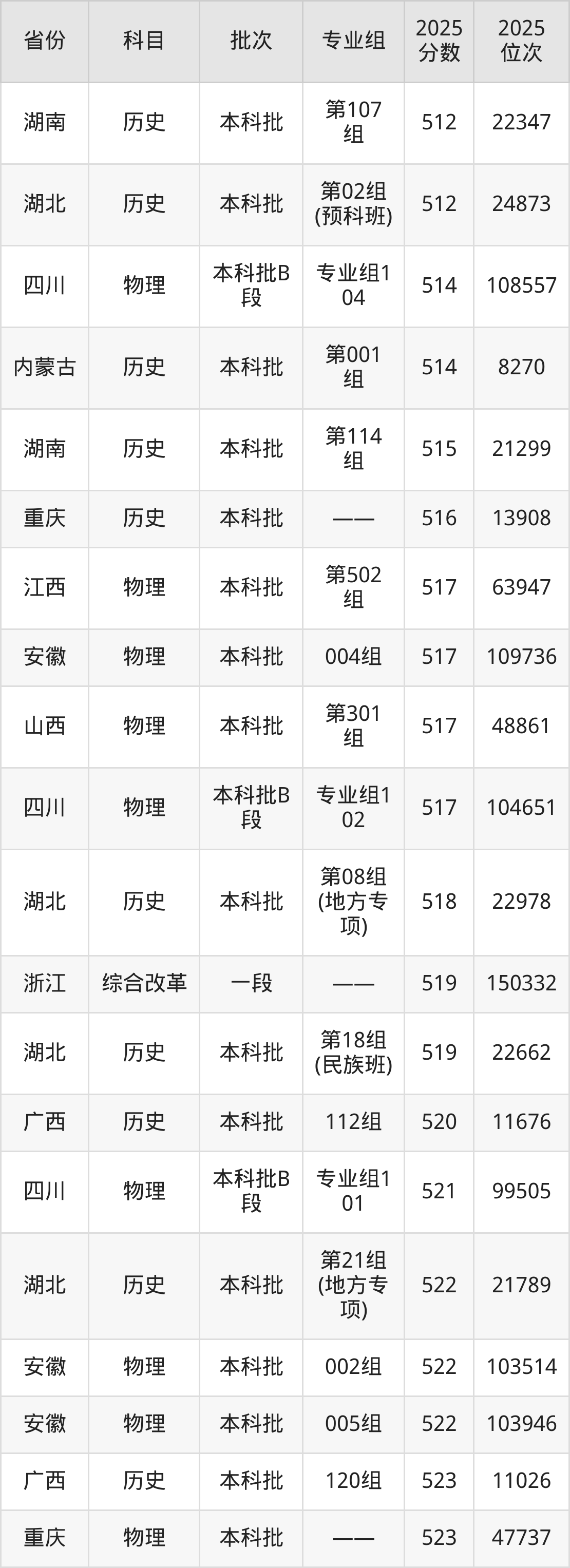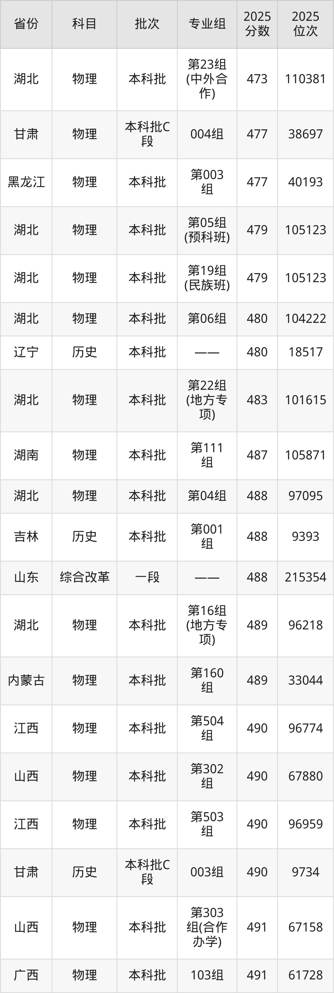 2025年湖北民族大学在各省普通批录取分数线一览表: