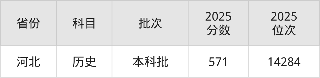 最低录取分数线是571分,对应位次是14284名,招生地区为河北。