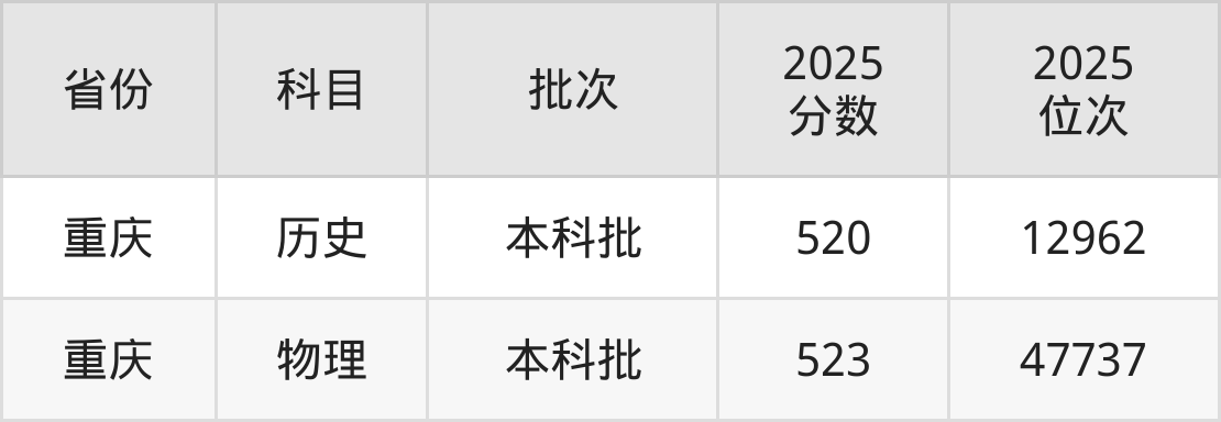 最低录取分数线是520分,对应位次是12962名,招生地区为重庆。