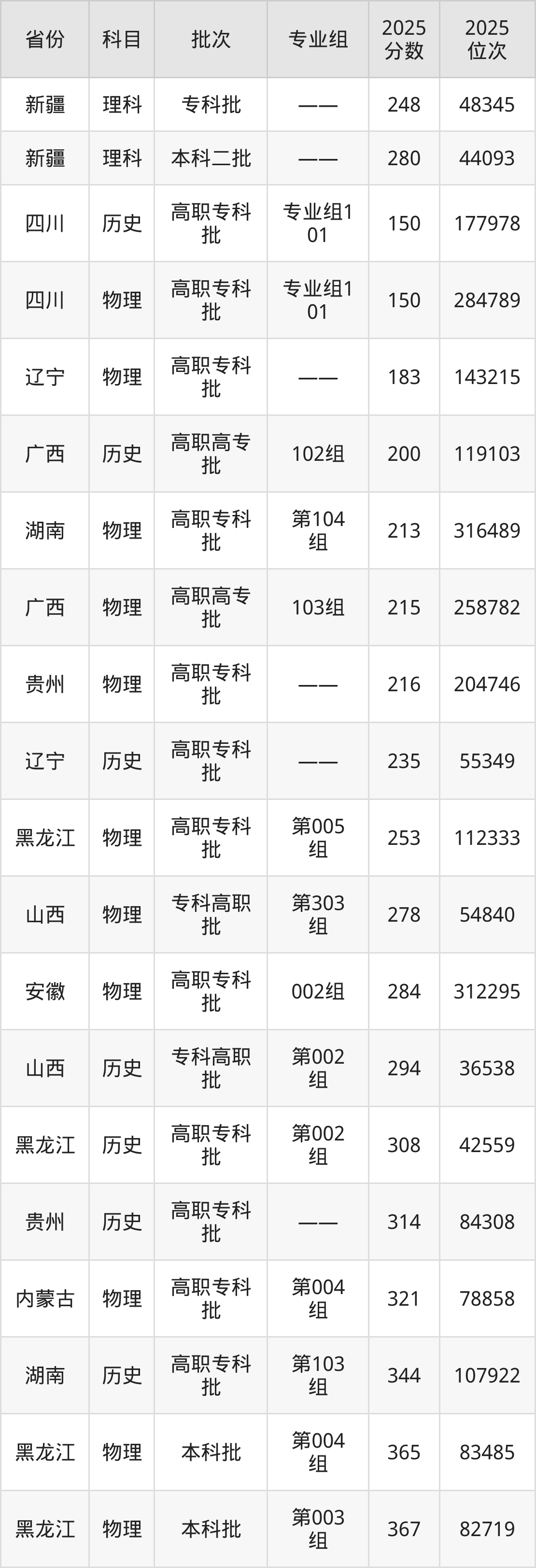 最低录取分数线是150分,对应位次是177978名,招生地区为四川;