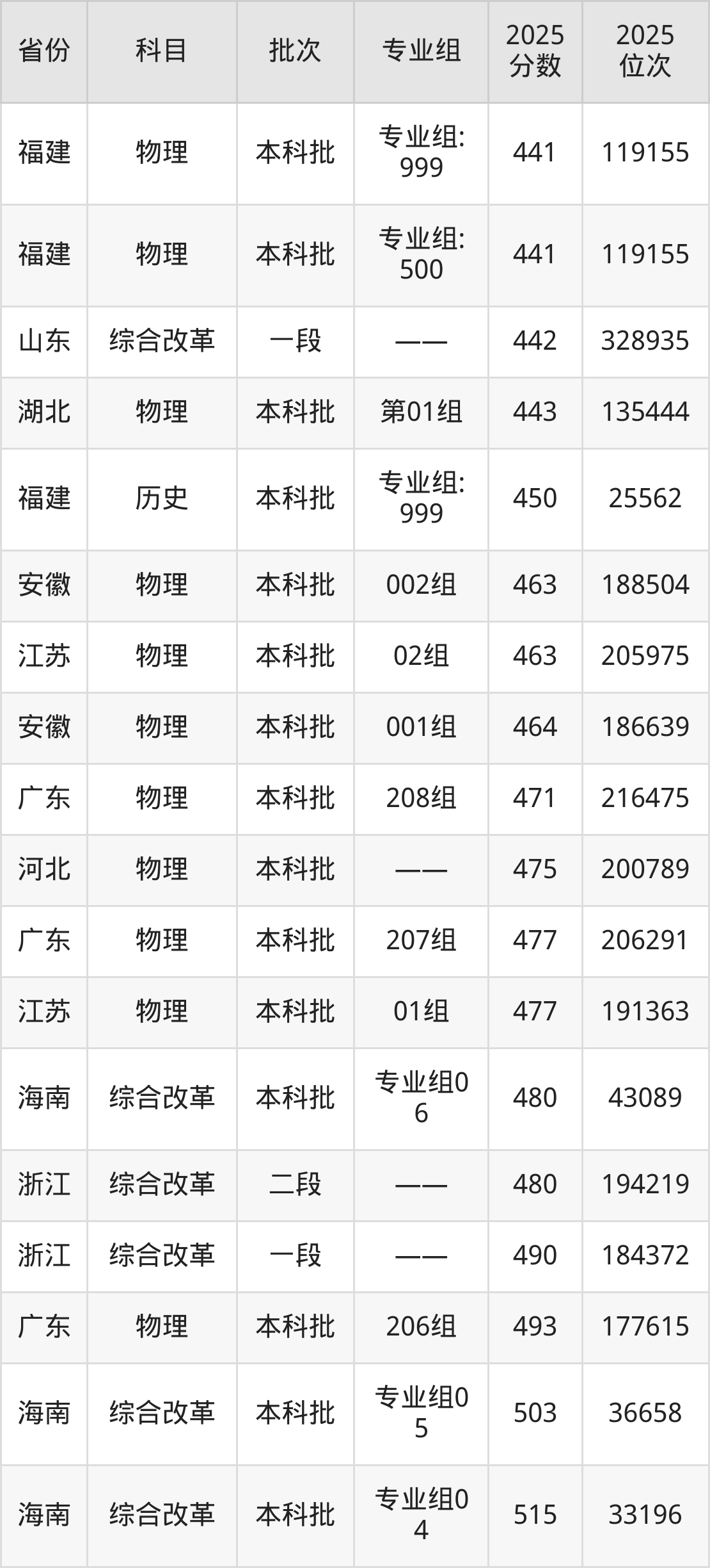 最低录取分数线是450分,对应位次是25562名,招生地区为福建。