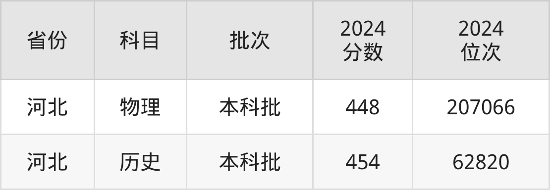 最低录取分数线是448分,对应位次是207066名,招生地区为河北。