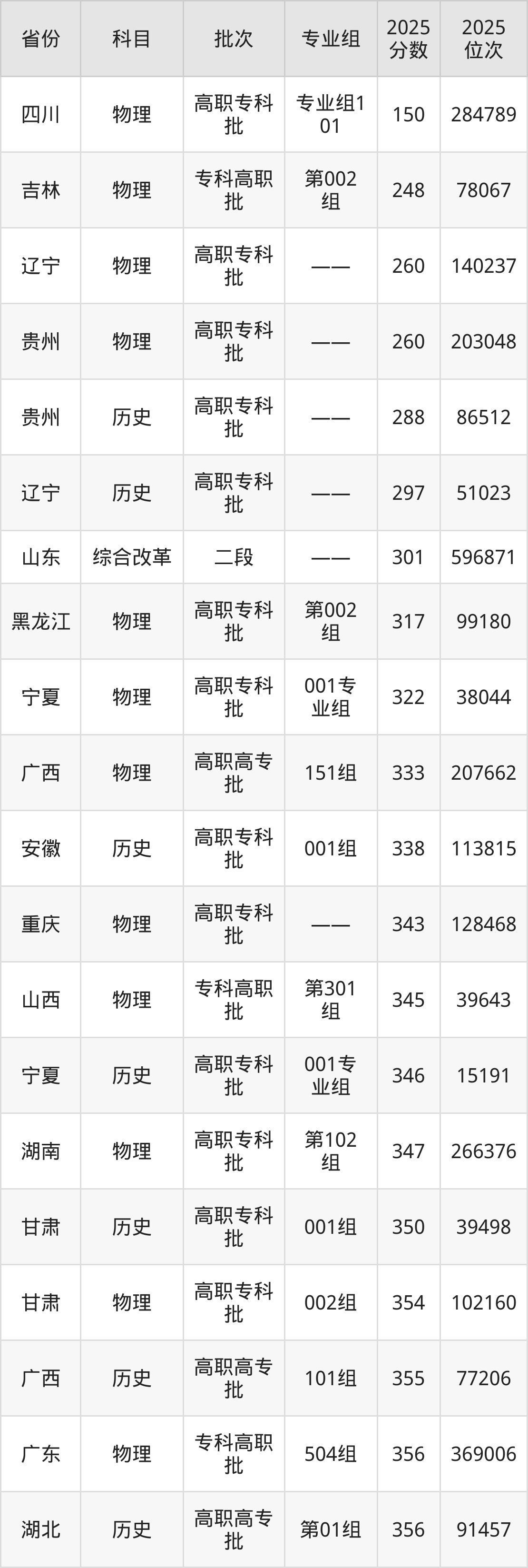最低录取分数线是150分,对应位次是284789名,招生地区为四川;