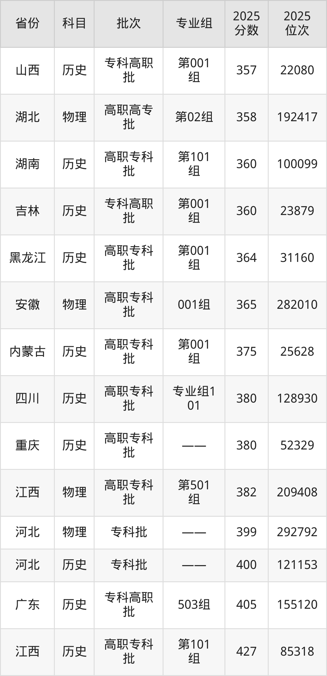 2025年安阳职业技术学院在各省普通批录取分数线一览表: