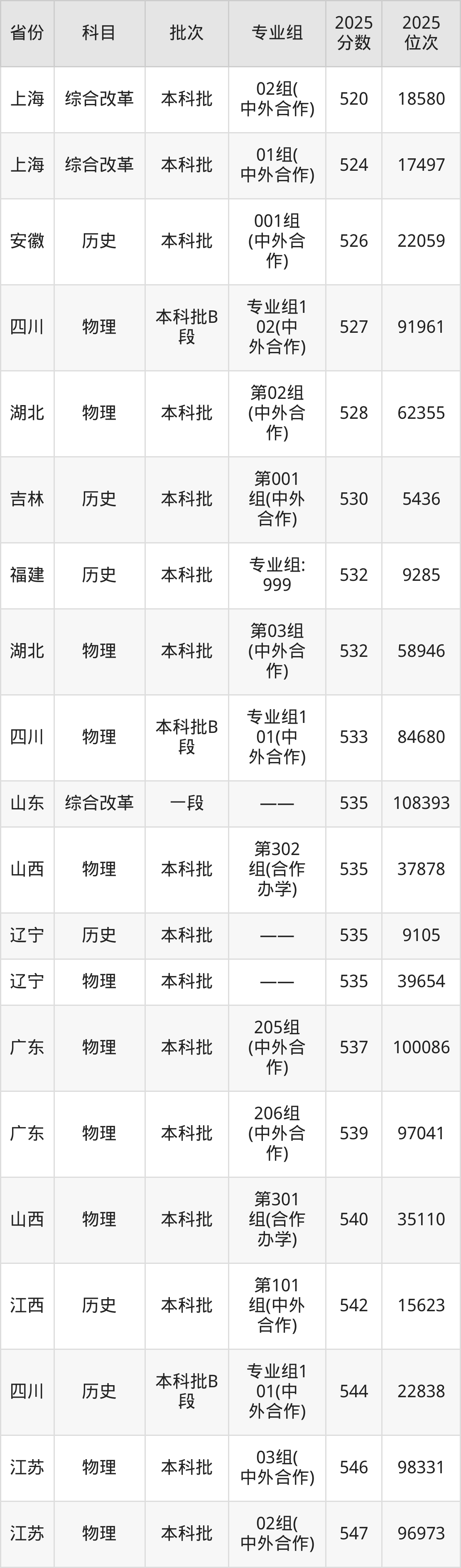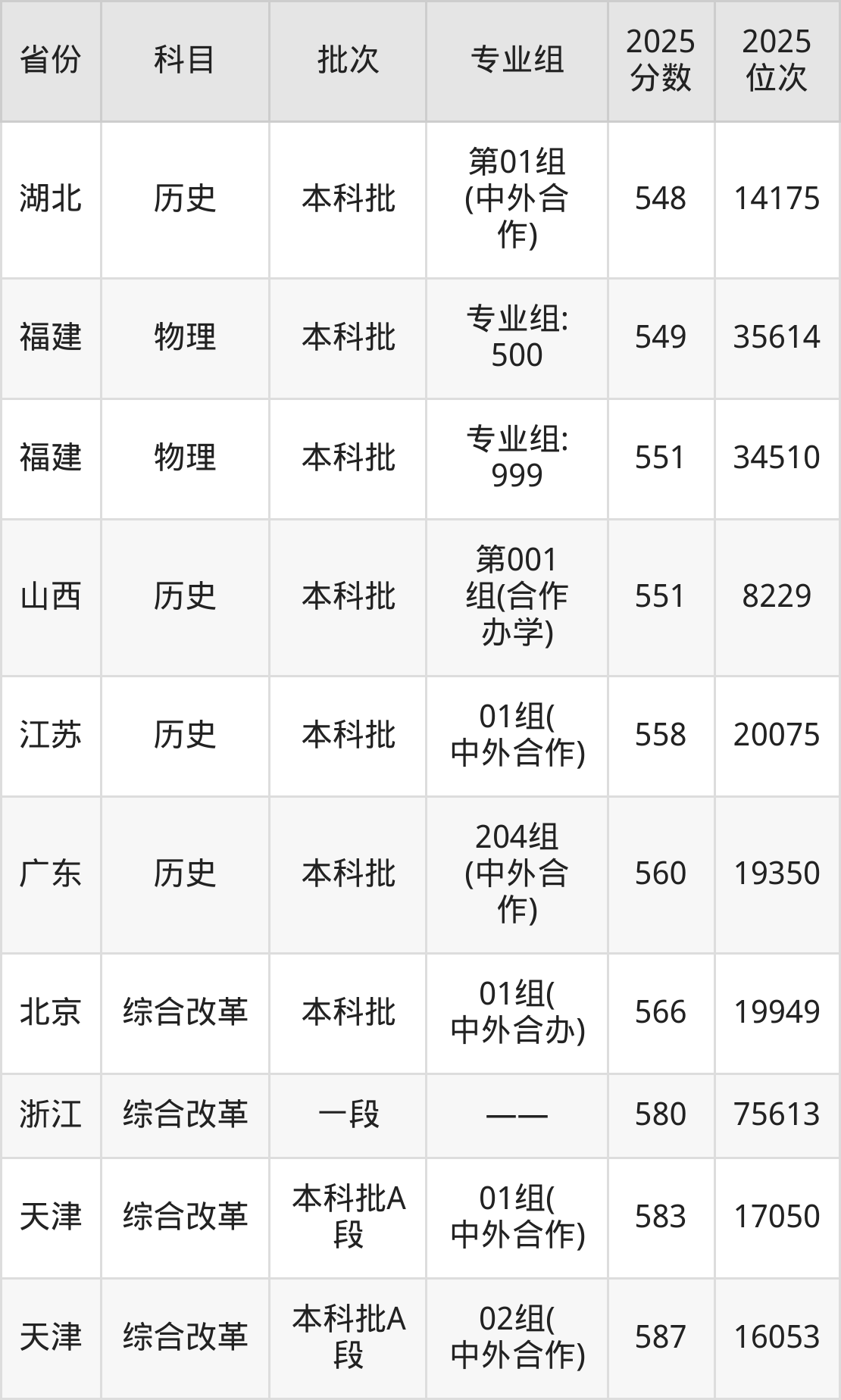 2025年温州肯恩大学在各省普通批录取分数线一览表: