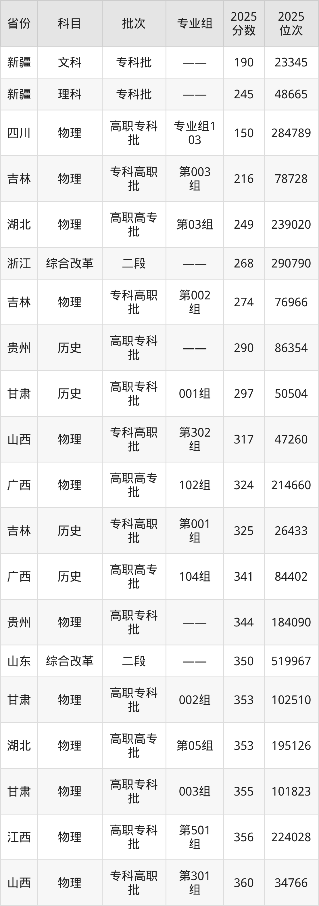 最低录取分数线是190分,对应位次是23345名,招生地区为新疆;