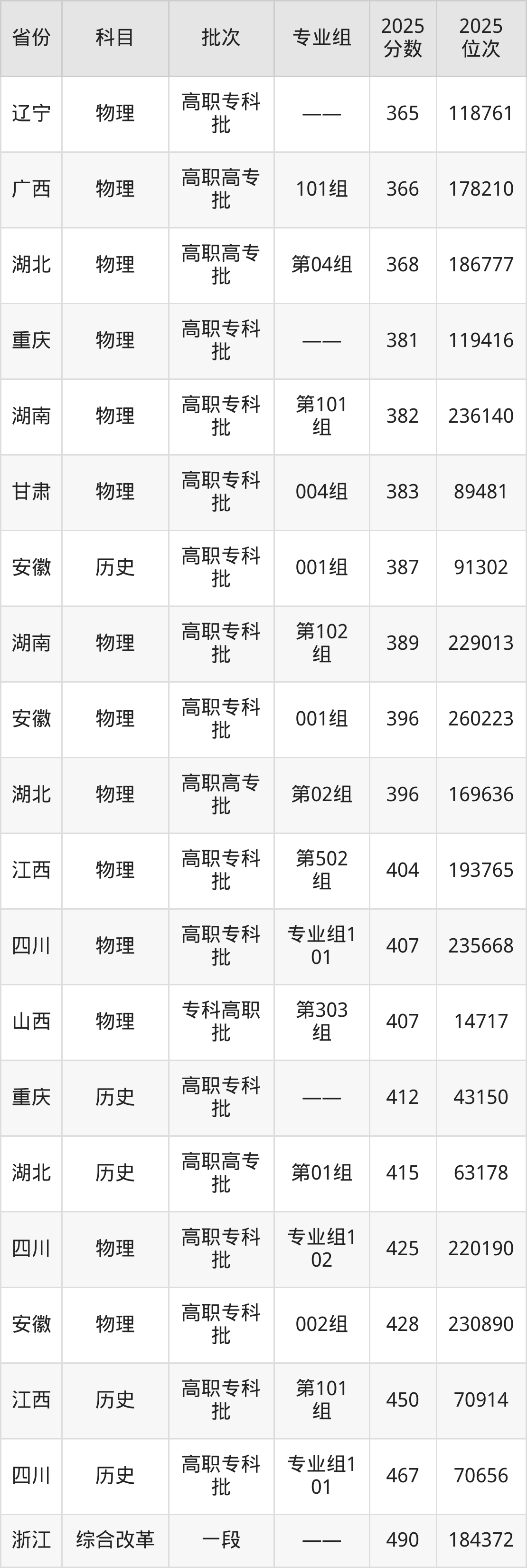 2025年昆明冶金高等专科学校在各省普通批录取分数线一览表: