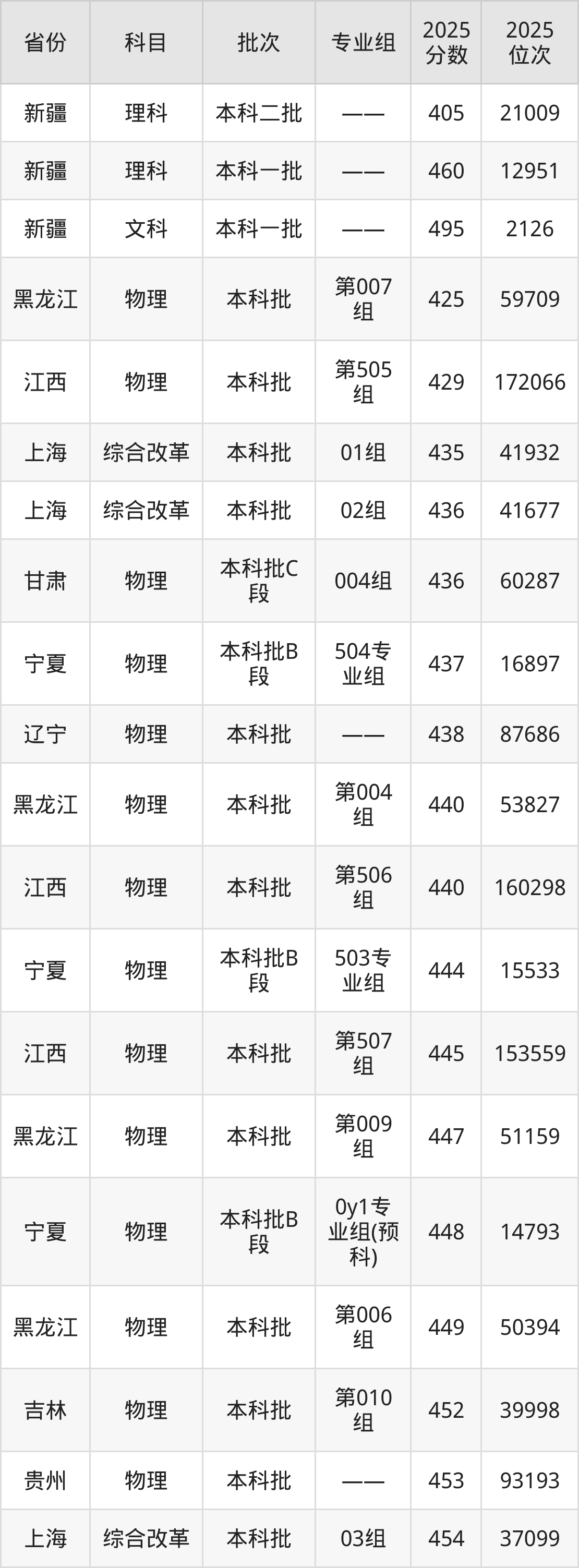 最低录取分数线是405分,对应位次是21009名,招生地区为新疆;