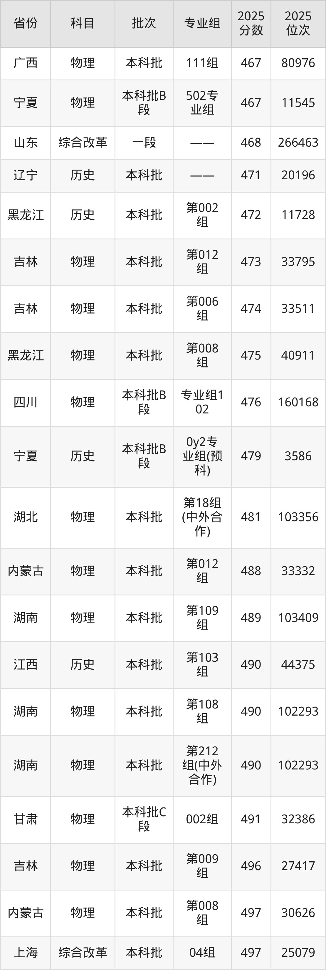 最低录取分数线是471分,对应位次是20196名,招生地区为辽宁;