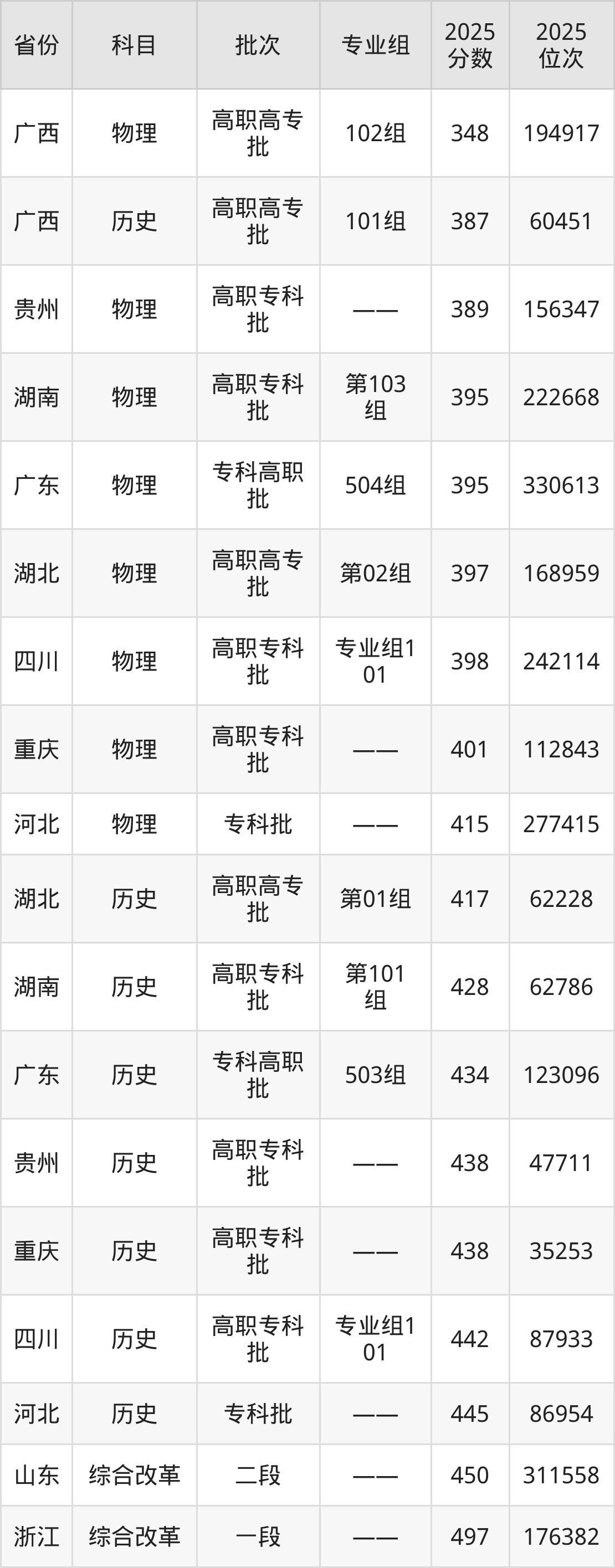 2025年湖南司法警官职业学院在各省普通批录取分数线一览表: