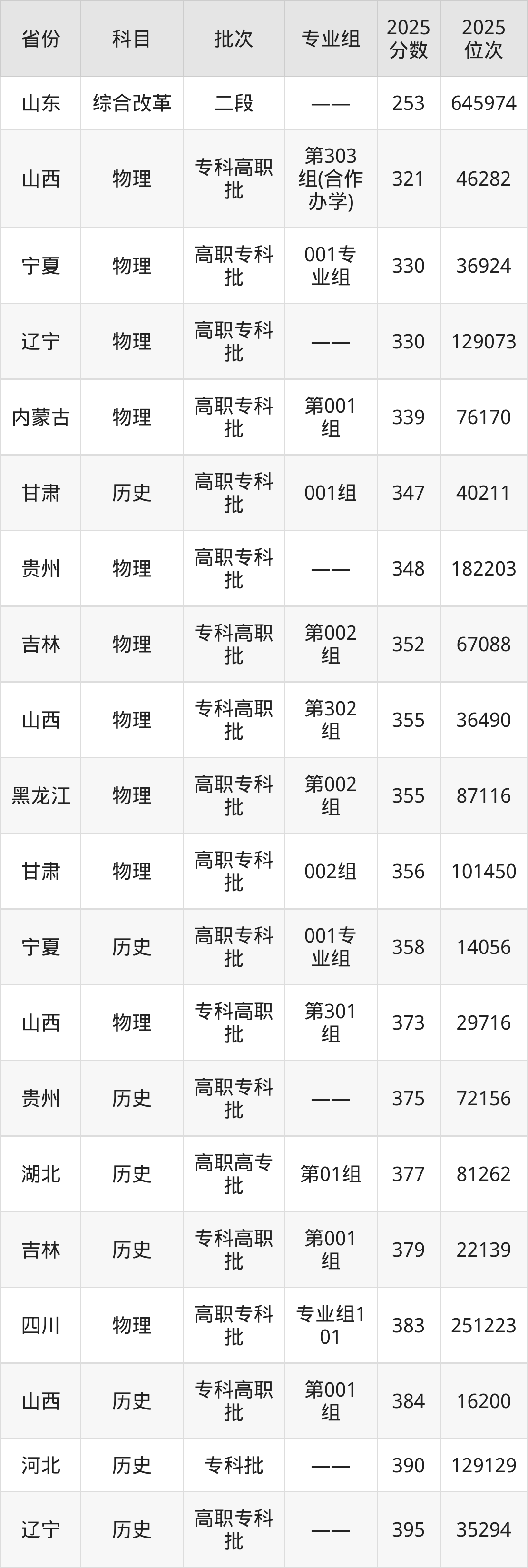 2025年青岛职业技术学院在各省普通批录取分数线一览表: