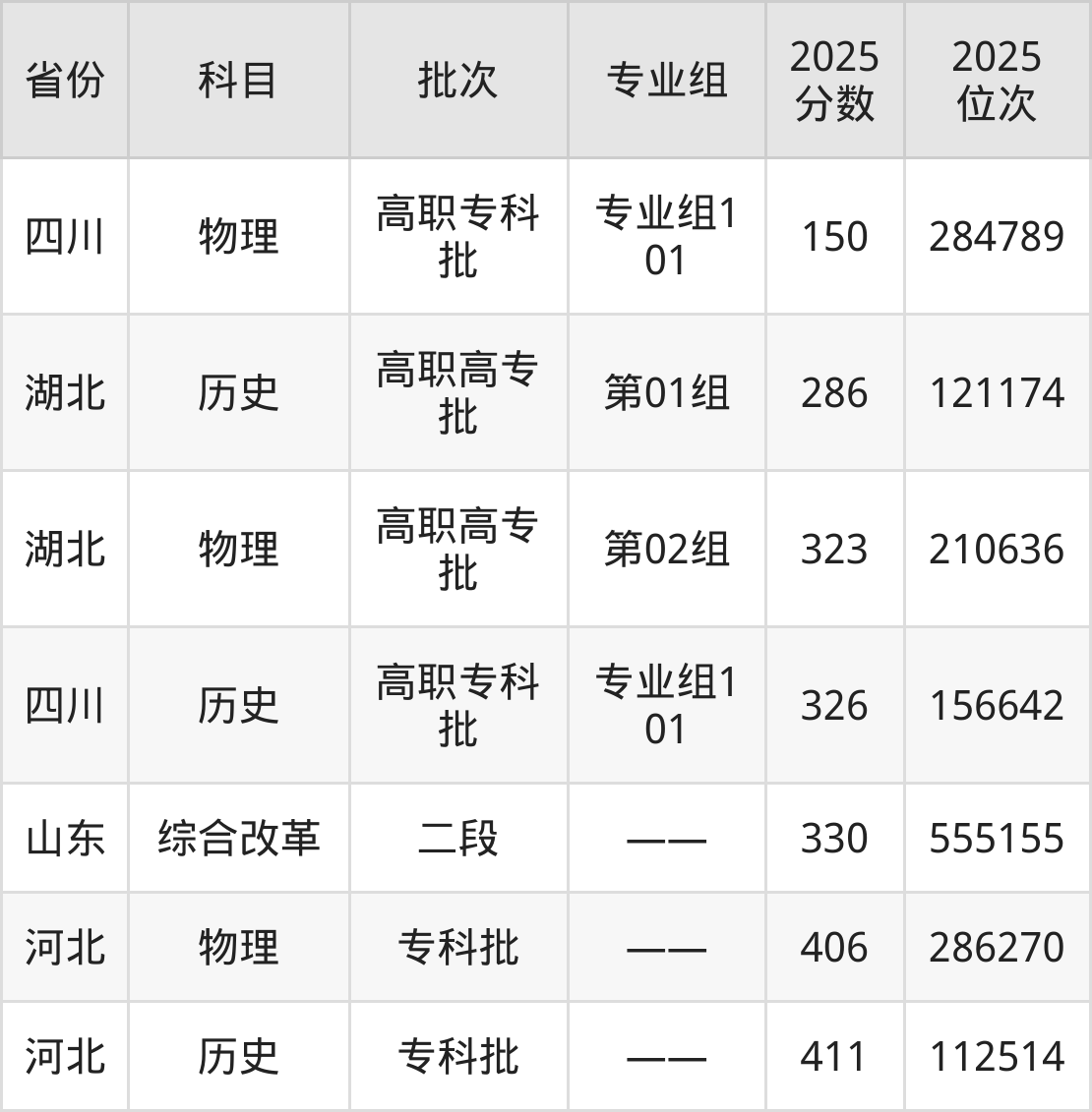 最低录取分数线是150分,对应位次是284789名,招生地区为四川;